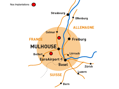 Idéalement situé en Alsace, au coeur de la région des 3 frontières (point de rencontre entre la Suisse, l'Allemagne et la France), nous sommes au plus proche des grands axes de communications (autoroutes, routes nationales, aéroport de Bâle-Mulhouse, ports autonomes de Mulhouse et de Strasbourg).